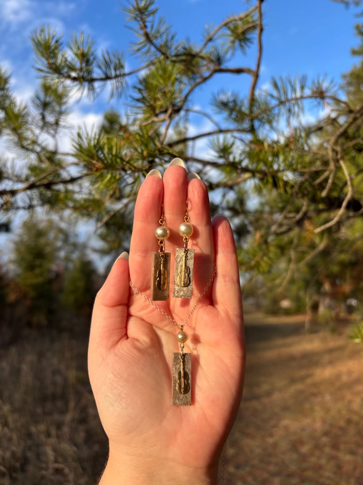 Handmade with gold plated findings, antique faux pearl and brass accents, and lots of love.