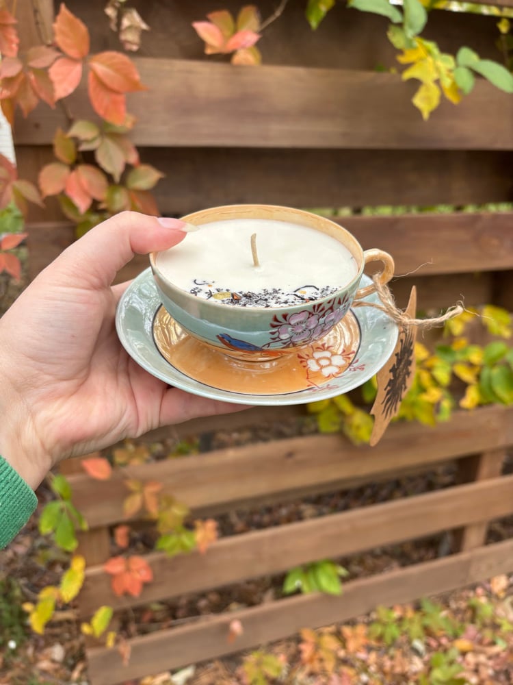 Handpoured with organic soy wax in an upcycled vessel! Scented with chai tea, cinnamon, & vanilla. Topped with chai leaves.