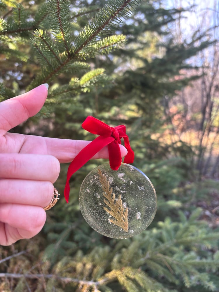 4 matching ornaments made with real pressed cedar & other inclusions. Handmade, hand-drilled, & hand strung with ribbons or string.